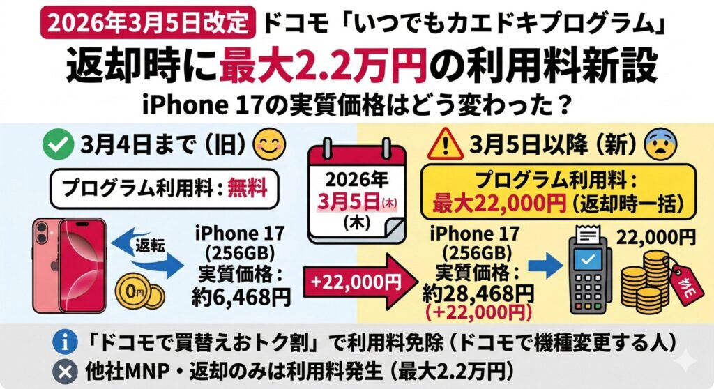 【2026年3月5日改定】ドコモ「いつでもカエドキプログラム」返却時に最大2.2万円の利用料新設|iPhone 17の実質価格はどう変わった?