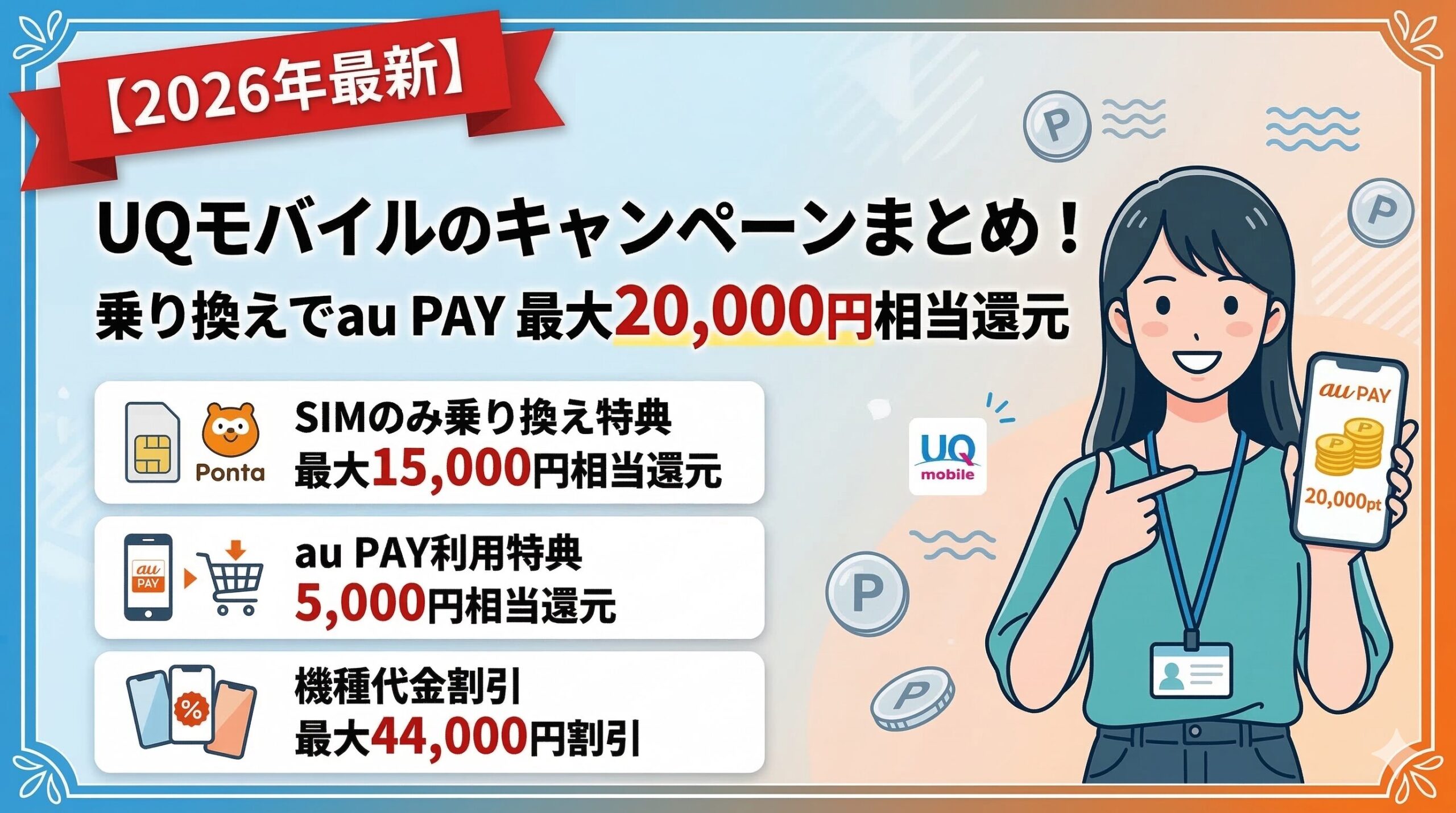 UQモバイルでは2026年3月現在、SIMのみ乗り換えでau PAY最大20,000円相当還元など複数のキャンペーンが実施中です。コスパ重視の方に人気の格安キャリアの最新情報をまとめて解説します。