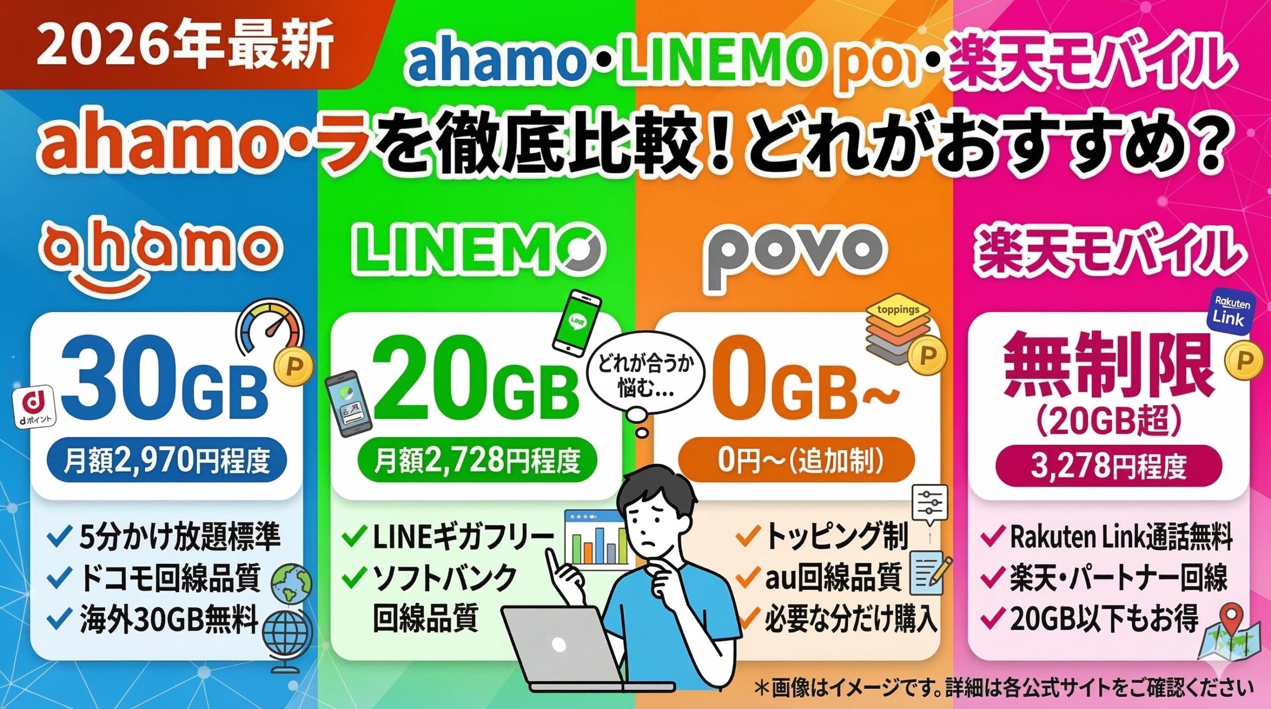 ahamo・LINEMO・povo・楽天モバイルを徹底比較!どれがおすすめ?【2026年3月最新】