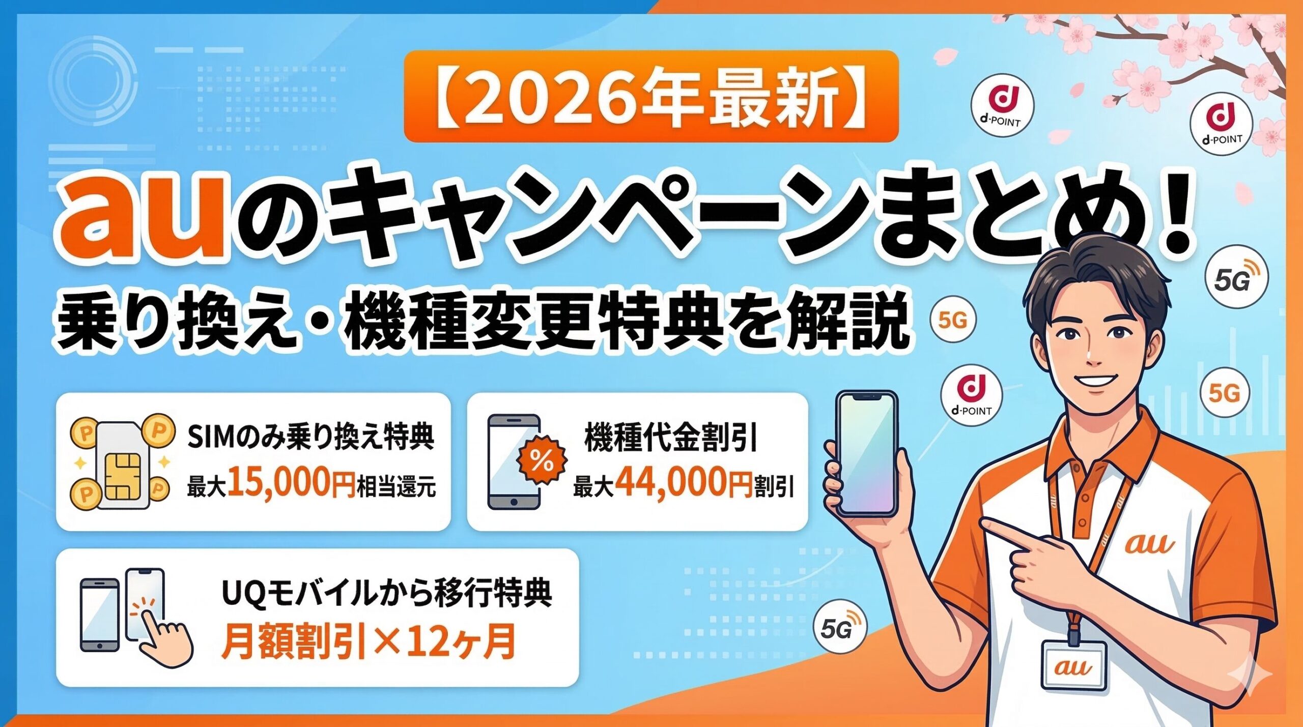au(エーユー)では2026年3月現在、SIMのみ乗り換えで最大15,000円相当還元や機種代金最大44,000円割引など複数のキャンペーンが実施中です。乗り換えを検討している方に向けて最新特典をまとめて解説します。
