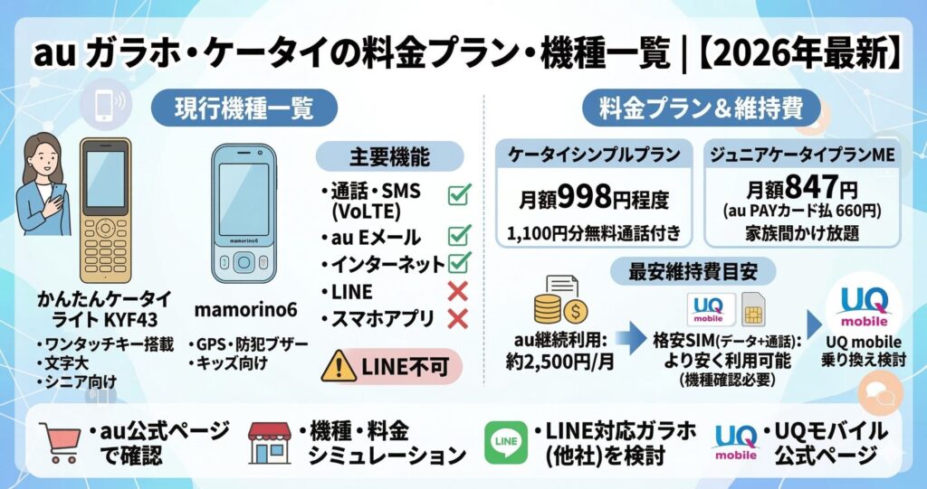 au ガラホ・ケータイの料金プラン・機種一覧|最安維持費は?【2026年最新】