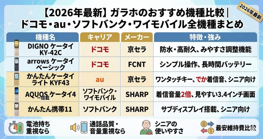 【2026年最新】ガラホのおすすめ機種比較|ドコモ・au・ソフトバンク・ワイモバイル全機種まとめ