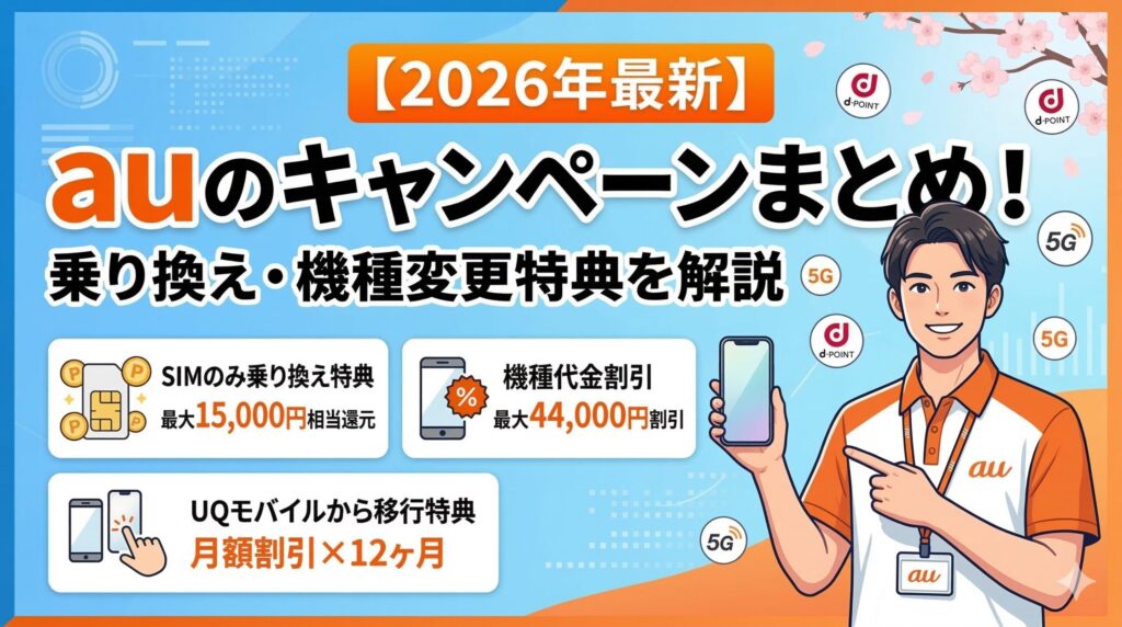 au(エーユー)では2026年3月現在、SIMのみ乗り換えで最大15,000円相当還元や機種代金最大44,000円割引など複数のキャンペーンが実施中です。乗り換えを検討している方に向けて最新特典をまとめて解説します。 2026年3月に実施中のauキャンペーン一覧 キャ... -