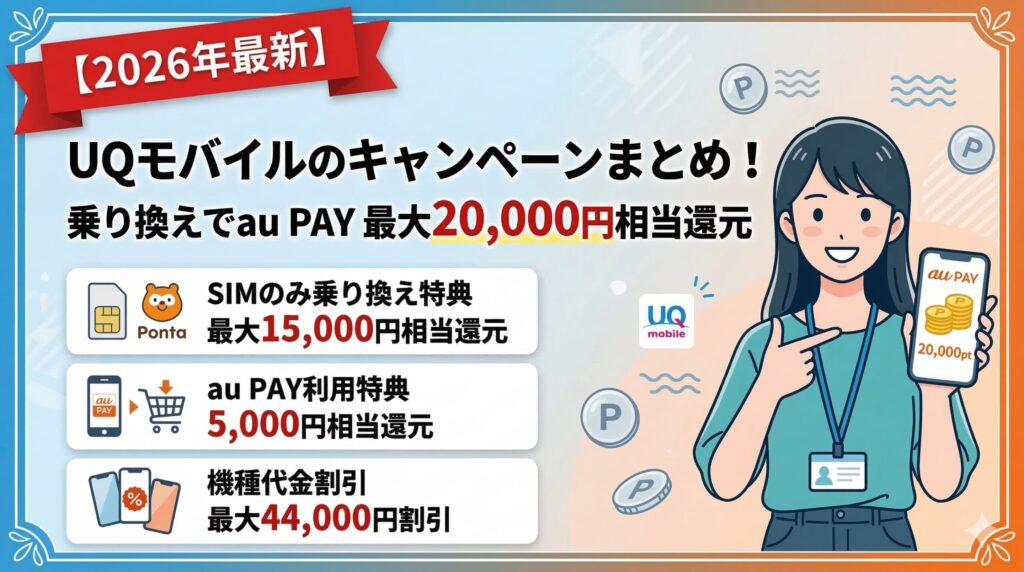 【2026年3月】UQモバイルのキャンペーンまとめ!乗り換えでau PAY最大20,000円相当還元