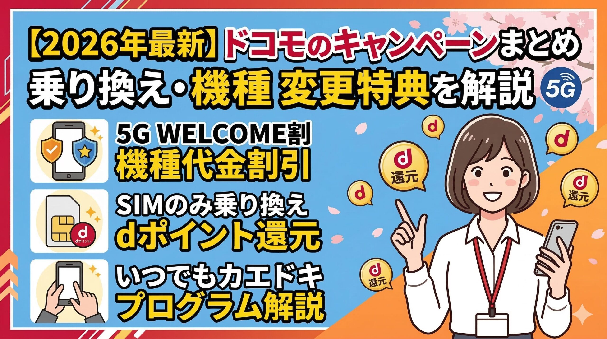 ドコモ(docomo)では2026年3月現在、MNP乗り換えで最大20,000dポイント還元・5G WELCOME割に加え、ahamoユーザー向けの新特典「ahamo→MAXのりかえ割」など複数のキャンペーンを実施中です。お得に乗り換えるためのポイントを最新情報でまとめて解説します。