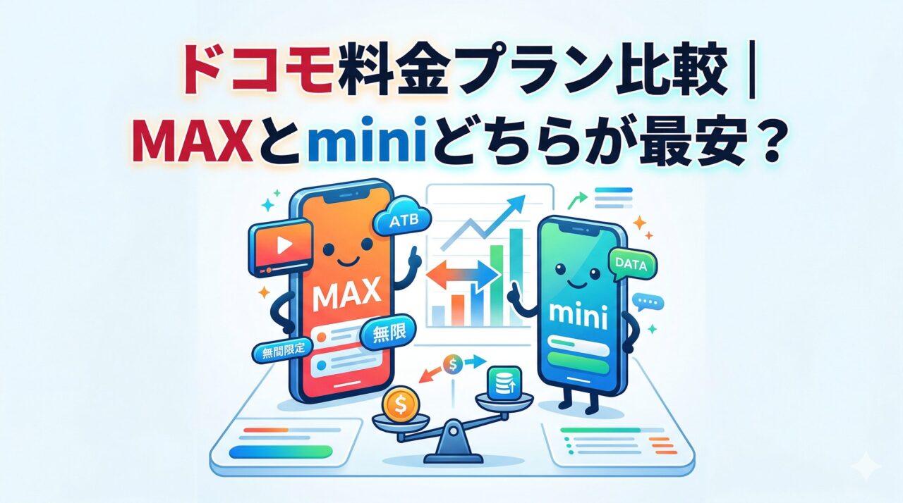 ドコモ料金プラン比較で迷っていませんか?2025年6月の刷新で「ドコモMAX」「ドコモmini」「ドコモポイ活MAX」「ドコモポイ活20」の4プランが中心になりました。割引条件によって月額が大きく変わるうえ、2026年4月30日でポイ活キャンペーンが終了します。この記事では2026年4月時点の最新料金・割引情報と5月以降の最適プランを徹底解説します。