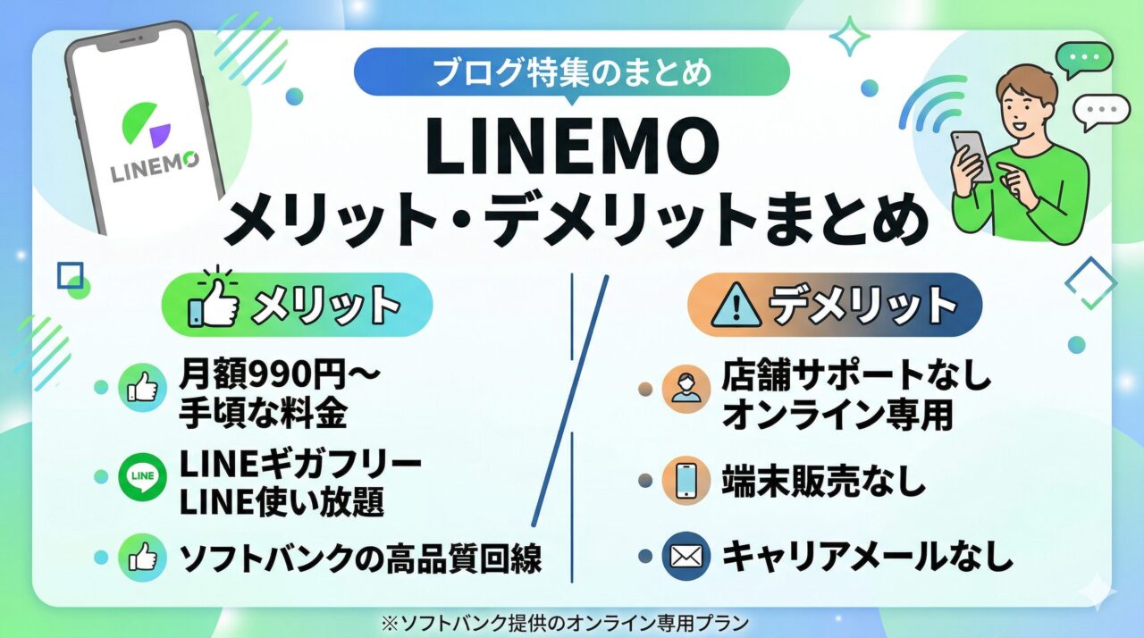 LINEMO(ラインモ)はソフトバンクが提供するオンライン専用の格安プランです。LINEのデータ消費がゼロになる「LINEギガフリー」や、月額990円(税込)から使える手頃な料金が魅力ですが、店舗サポートがない点や端末販売がない点には注意が必要です。