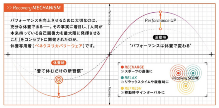 緊張した状態をほぐすには、ゆるやかでやさしい刺激が有効とされます。例えばやさしいマッサージ、ぬるめの風呂への入浴、アロマテラピーなど匂い成分がもたらす刺激などがよく知られています。ほっとカラダの緊張が解けて、リラックスしている状態、それが上質な休養と言えるもので、現代を生きる忙しい人々に、このようなコンディションをお届けするのがリカバリーウェアです。「ただ着るだけ」で心地よい環境を整え「上質な休養」が得られるよう開発されました。