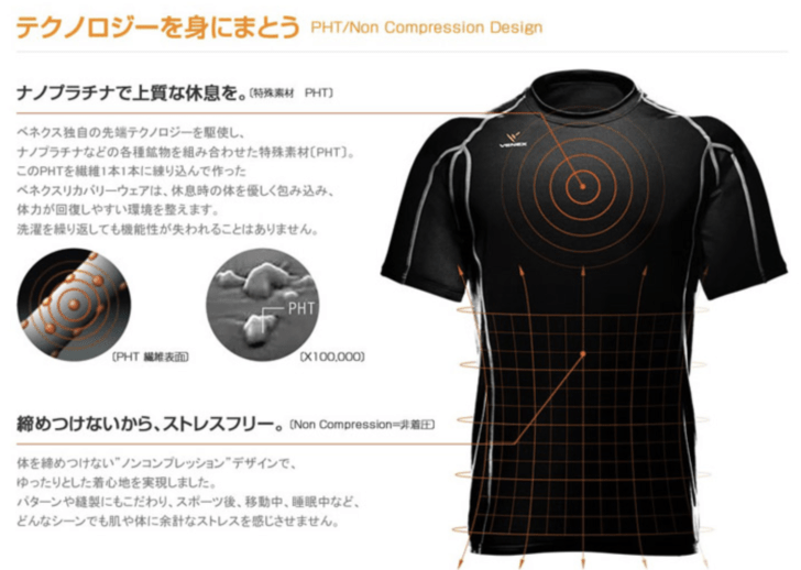 - リカバリーウェアにナノプラチナなどの鉱物が練り込まれた繊維(PHT)