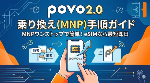 povo2.0の公式アプリをダウンロードして申し込みを開始します。MNP予約番号・本人確認書類(マイナンバーカードまたは運転免許証等)を用意してください。SIMの選択(eSIM or 物理SIM)も申し込み時に行います。