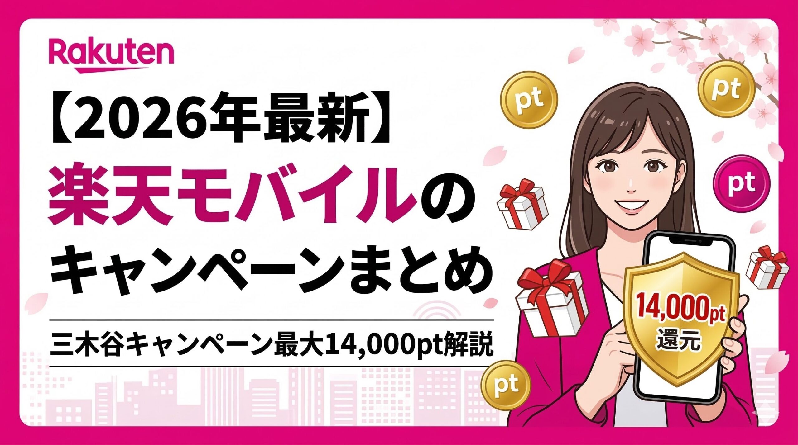 楽天モバイルでは2026年3月現在、三木谷キャンペーンでMNP乗り換え最大14,000ポイント還元など複数の特典が実施中です。Rakuten最強プランの内容と合わせて解説します。